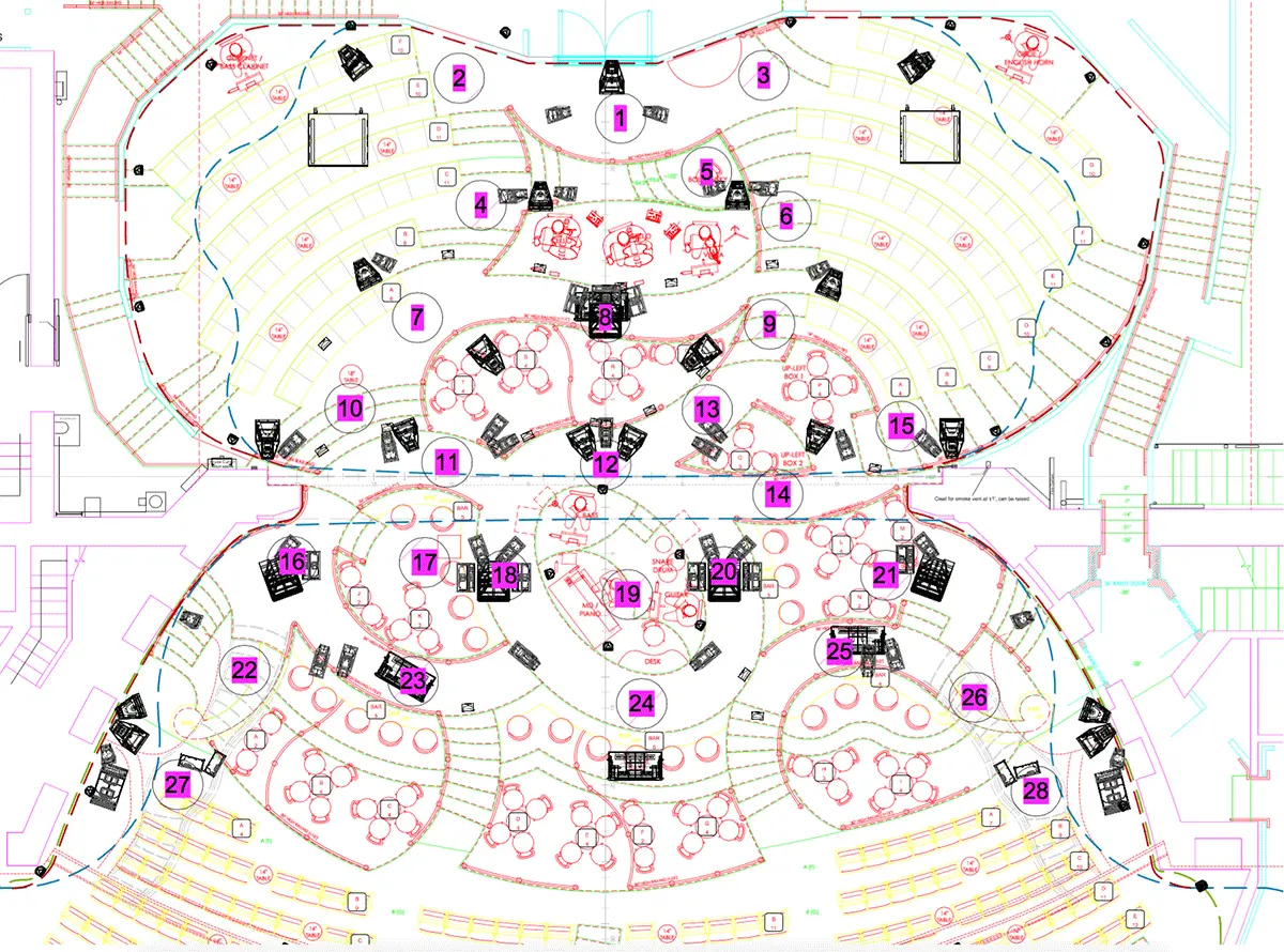 The numbered “narrative locations” are used as reference points for localization panning, shown here in relationship to the Meyer Sound loudspeaker arrays.