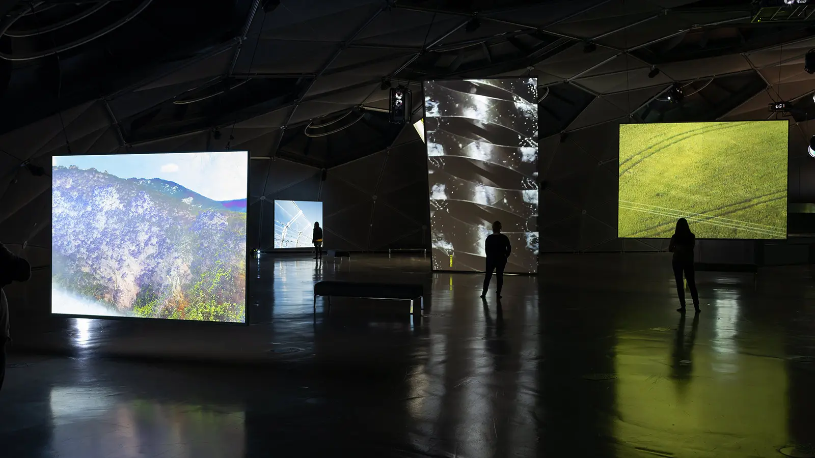 A new exhibition by renowned sound artist Bill Fontana entitled Primal Energies opened July 1 at Kunsthaus Graz in Austria. Occupying the museum’s vast ovoid-dome Space 01 Gallery, Primal Energies pays homage to the future of renewable energy through a mesmerizing mix of video imagery and evocative soundscapes that portray our planet’s expanding wind, solar, hydroelectric and geothermal resources. While viewing images on the eight large screens, visitors are immersed in an evocative blend of energy-related sounds reproduced by 64 Meyer Sound self-powered loudspeakers. The impact of the installation is further enhanced by dynamic spatial sound movements created and automated using a beta version of Meyer Sound’s soon-to-be-released Spacemap Go technology.