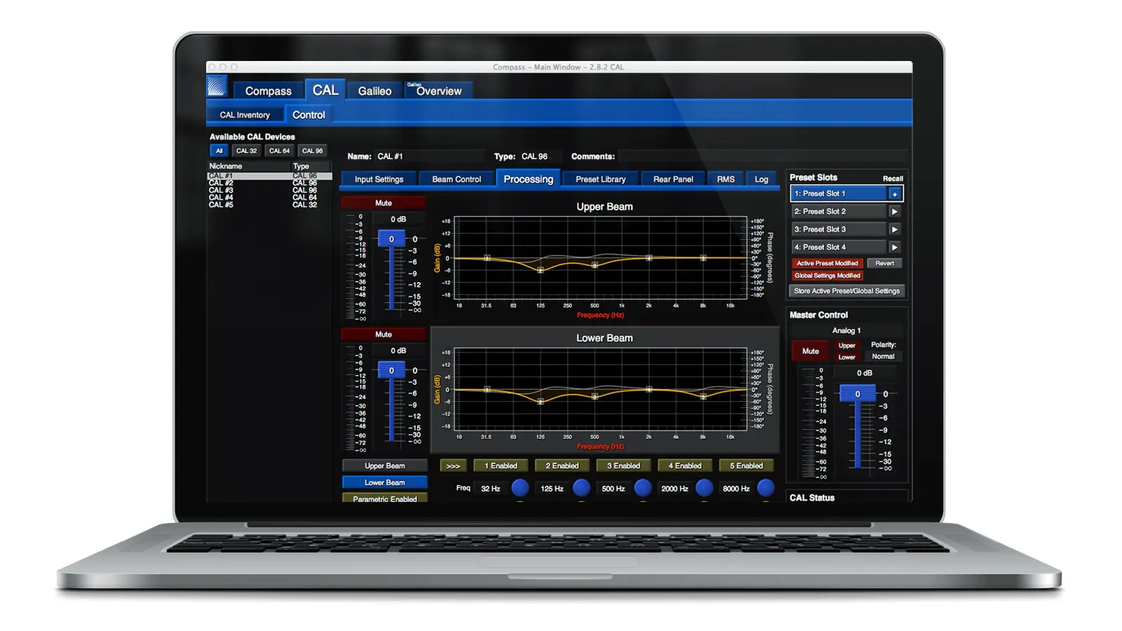 Compass provides a graphical user interface that displays detailed information and controls all device settings including GALAXY Control Pages, Parametric and U-Shaping EQ, AVB Network Settings, Delay Integration, High and Low Pass Filters, CAL Beam Control, and RMS.